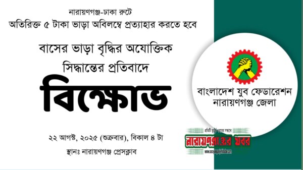 নারায়ণগঞ্জের খবর ডেস্কঃ বাস ভাড়া বৃদ্ধির প্রতিবাদে শনিবার সংবাদ সম্মেলন। ঢাকা-নারায়ণগঞ্জ রুটে বন্ধন ও উৎসব বাসের ভাড়া জেলা প্রশাসক কর্তৃক অযৌক্তিকভাবে বৃদ্ধি করার প্রতিবাদে... বিস্তারিত...