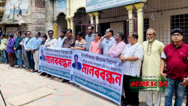 নারায়ণগঞ্জের খবর প্রতিবেদকঃ গাজীপুরে সাংবাদিক আসাদুজ্জামান তুহিনকে কুপিয়ে হত্যার প্রতিবাদে নারায়ণগঞ্জে মানববন্ধন অনুষ্ঠিত হয়েছে। রবিবার বেলা সাড়ে ১১টায় নারায়ণগঞ্জ জেলা সাংবাদিক ইউনিয়ন (এন ইউ... বিস্তারিত...