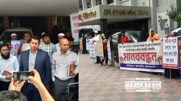 নারায়ণগঞ্জে এলিভেটেড এক্সপ্রেসওয়ে প্রকল্পের প্রতিবাদে মানববন্ধন