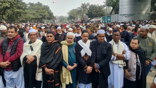 জাতীয় মসজিদ বায়তুল মােকাররমের খতিব মুফতি মাহাম্মদ আবদুল মালেক জানাজায় ইমামতি করেন। জানাজায় প্রধান উপদেষ্টা অধ্যাপক মুহাম্মদ ইউনূস, বিএনপির ভারপ্রাপ্ত চেয়ারম্যান তারেক রহমান, বিএনপির মহাসচিব মির্জা ফখরুল ইসলাম আলমগীরসহ, জামায়াত ইসলামীর আমির ডা. শফিকুর রহমান, জাতীয় নাগরিক পার্টির আহায়ক নাহিদ ইসলামসহ বিভিন রাজনৈতিক দলের নেতৃবৃন্দ এবং কুটনীতিক ও বিশিষ্টজনরা অংশ নন।